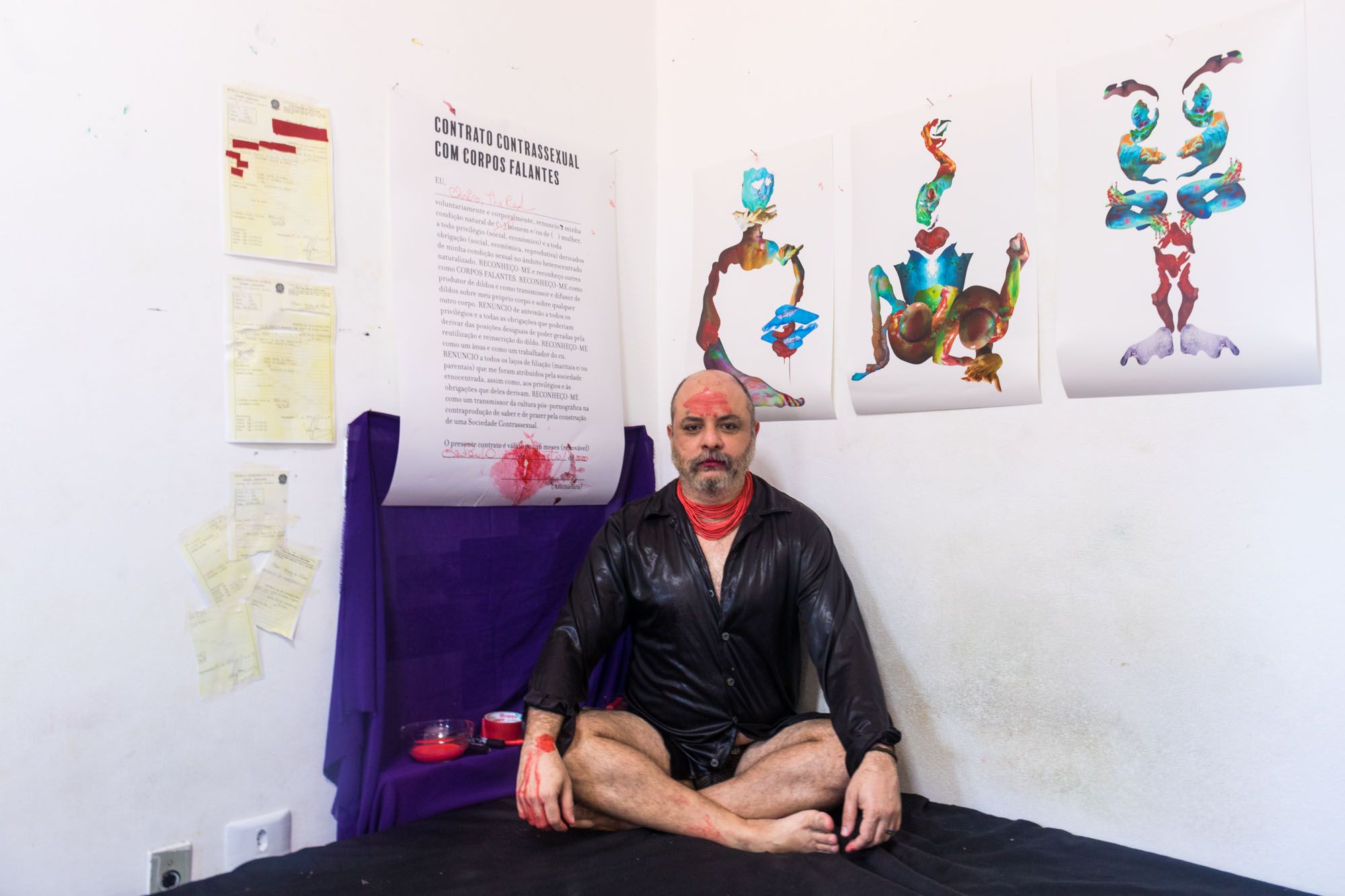 CONTRANOME: CHRIS (2020) é uma instalação fotoperformática que conversa com um dos pontos da sociedade contrassexual que é a ideia do Corpo Falante, apresentado por Paul B. Preciado, no livro Manifesto Contrassexual. Partindo dessa ideia, busco ressignificar não apenas seu corpo, mas também, sua identidade, provocando uma ruptura com tudo que é lançado sobre seu corpo a partir da sua certidão de nascimento – importante documento para o Estado, no qual temos através deste, o registro como pessoas identificadas e pertencentes aquela sociedade. Em outras palavras, corta relações com a masculinidade que lhe é imposta ao possuir um nome masculinizado, expressando novos olhares sobre seu corpo, recosturando seus membros de outras formas.