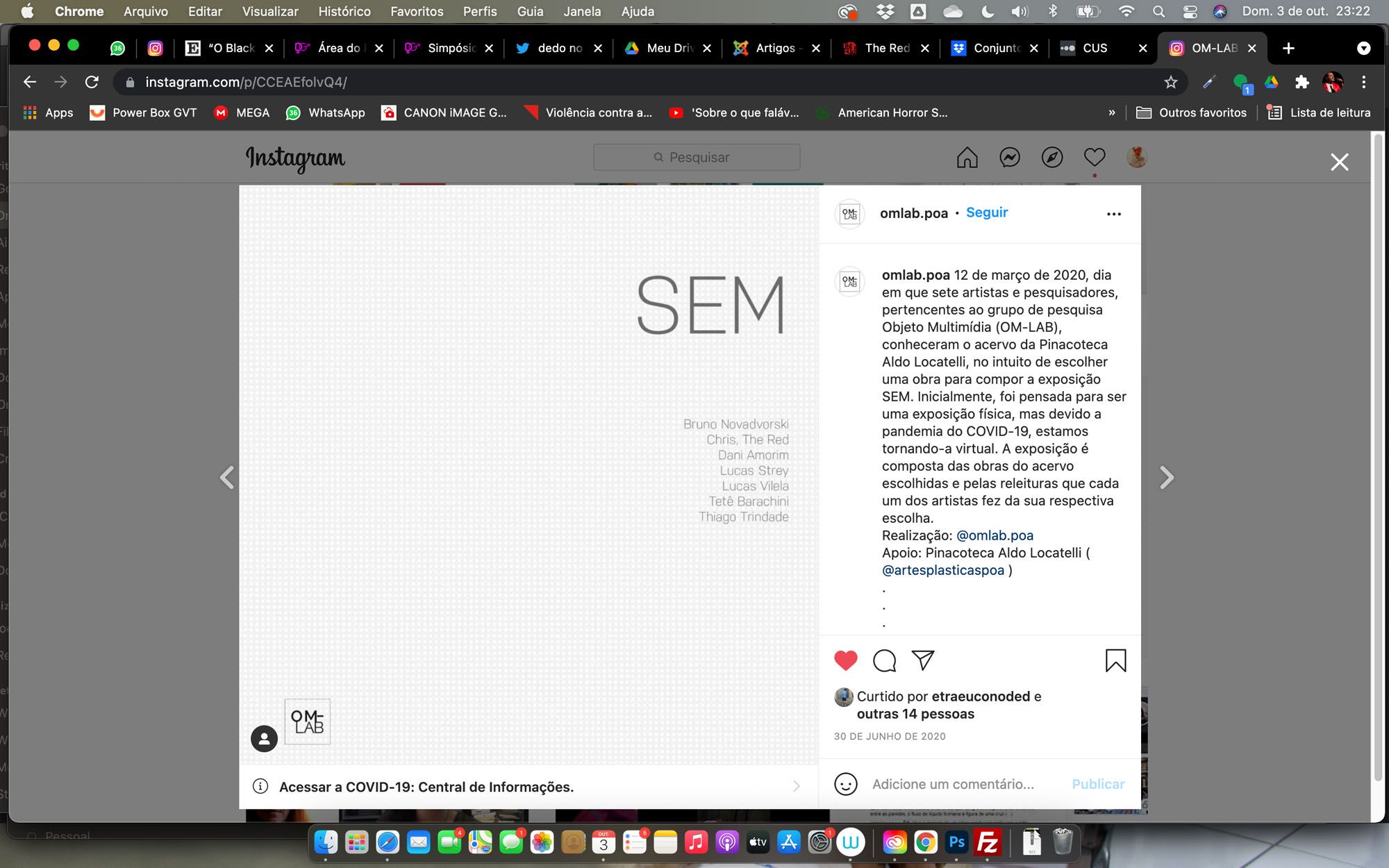 12 de março de 2020, dia em que sete artistas e pesquisadores, pertencentes ao grupo de pesquisa Objeto Multimídia (OM-LAB), conheceram o acervo da Pinacoteca Aldo Locatelli, no intuito de escolher uma obra para compor a exposição SEM. Inicialmente, foi pensada para ser uma exposição física, mas devido a pandemia do COVID-19, estamos tornando-a virtual. A exposição é composta das obras do acervo escolhidas e pelas releituras que cada um dos artistas fez da sua respectiva escolha e foi realizada no perfil de Instagram do OM-LAB, de 30 de junho a 24 de agosto de 2020 e lançamento do catálogo virtual no dia 18 de novembro de 2020.