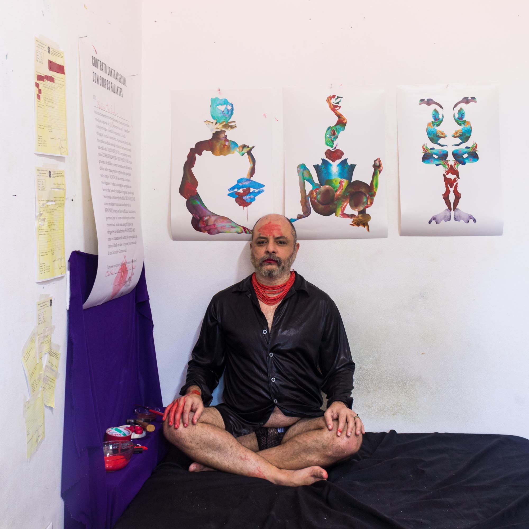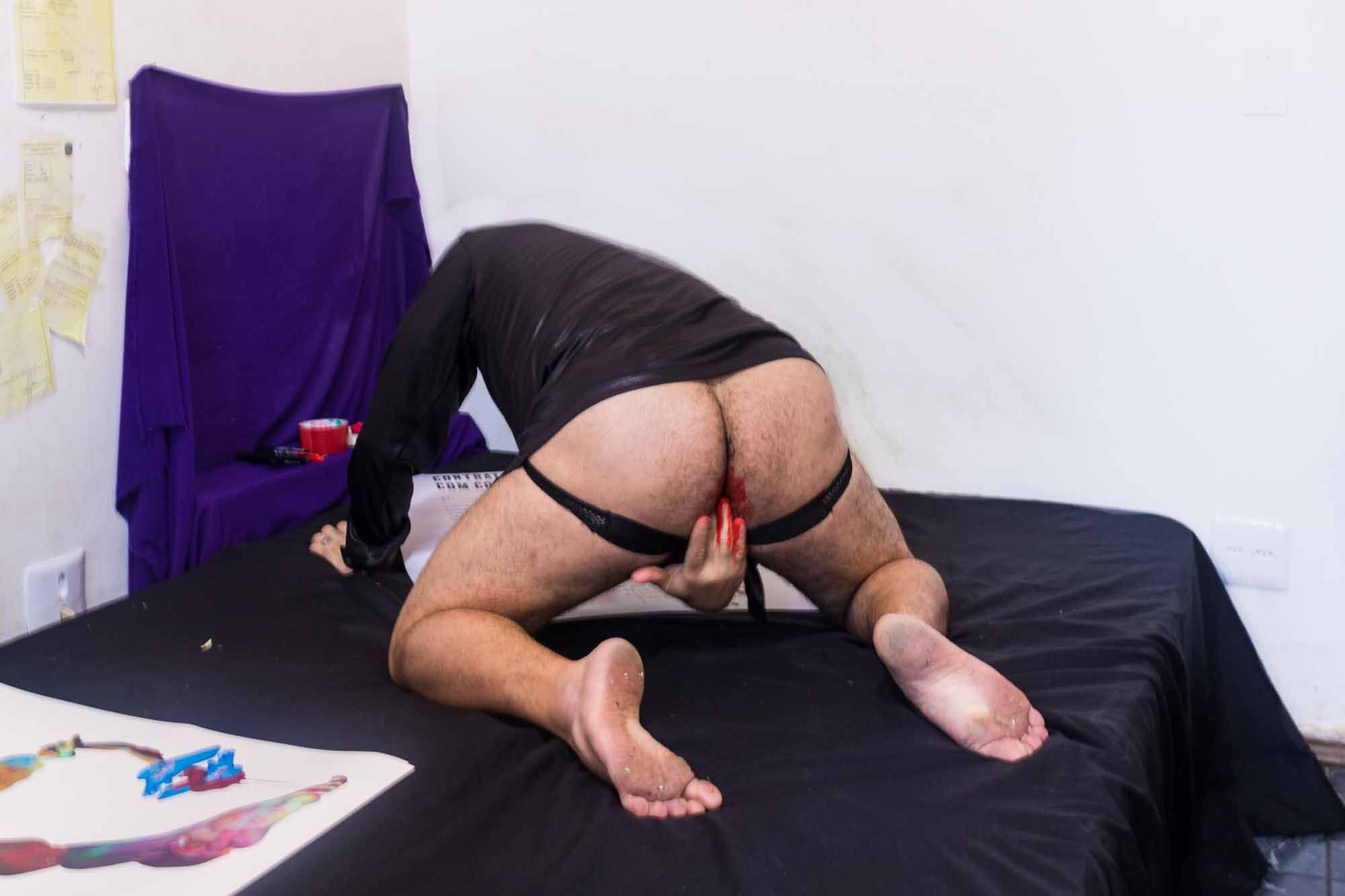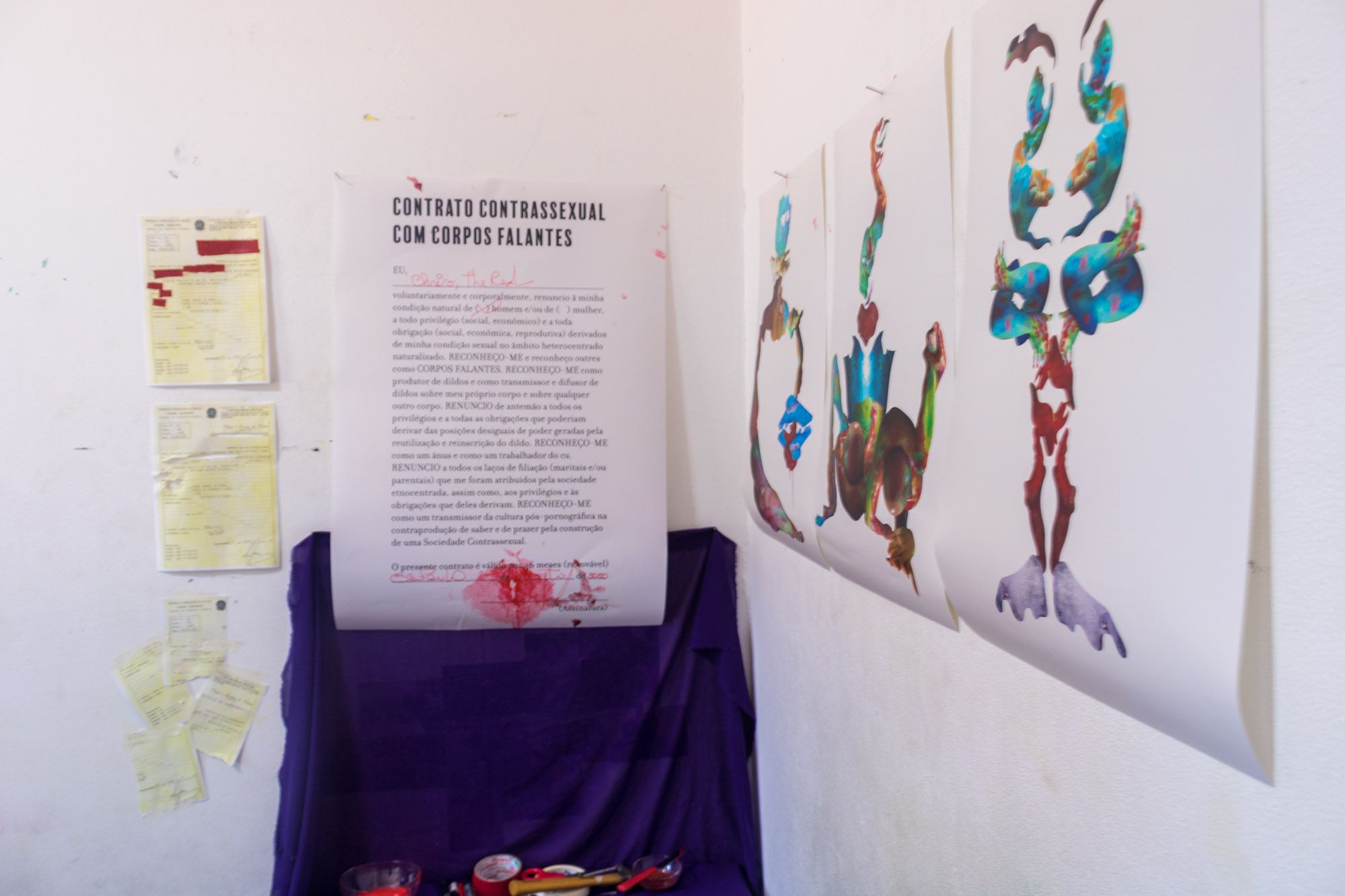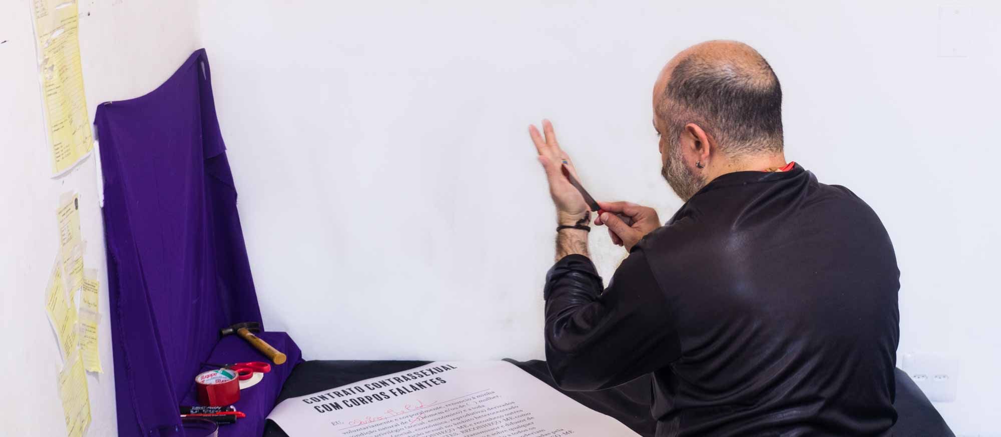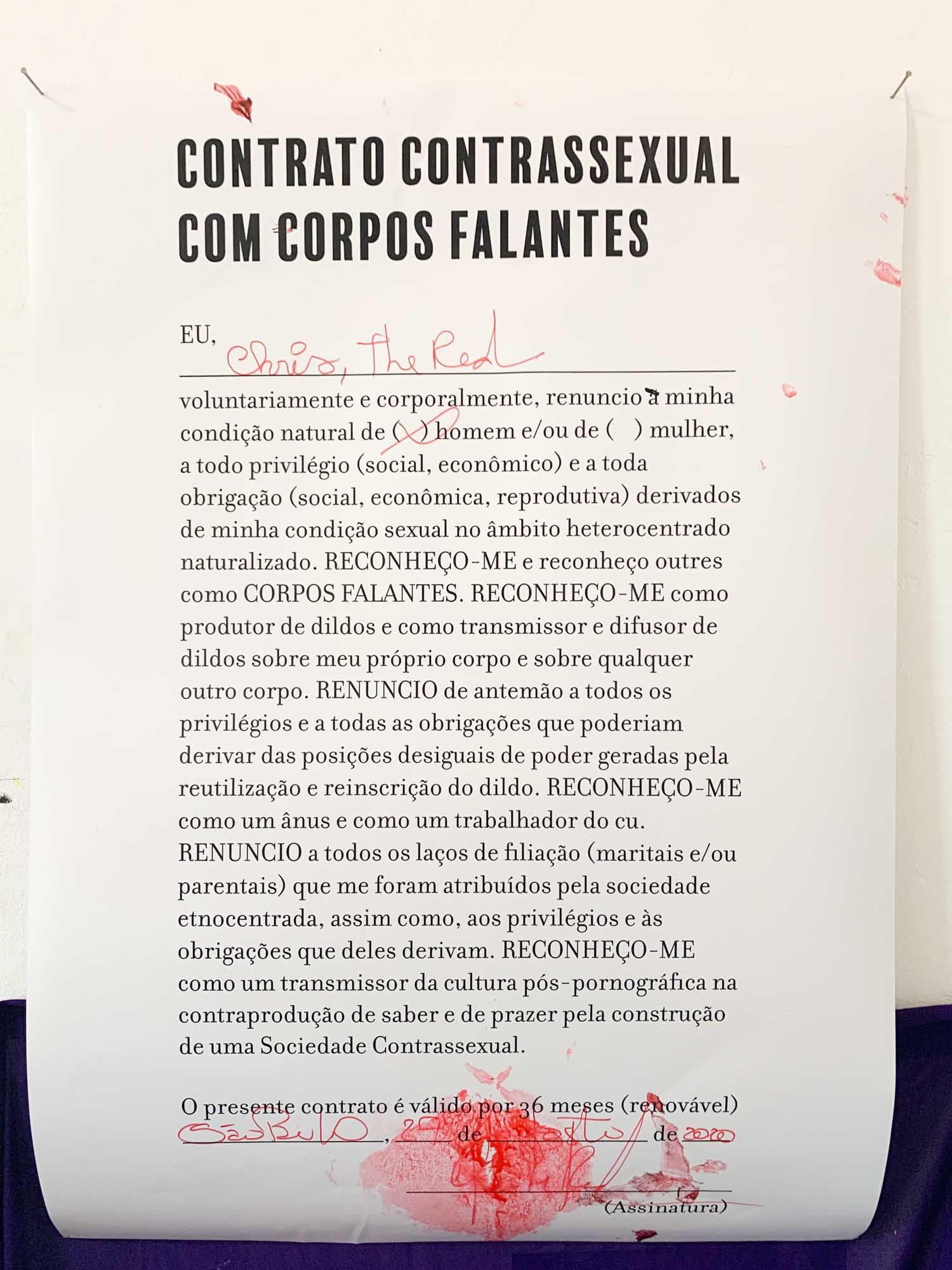 CONTRANOME: CHRIS (2020) é uma instalação fotoperformática que conversa com um dos pontos da sociedade contrassexual que é a ideia do Corpo Falante, apresentado por Paul B. Preciado, no livro Manifesto Contrassexual. Partindo dessa ideia, busco ressignificar não apenas seu corpo, mas também, sua identidade, provocando uma ruptura com tudo que é lançado sobre seu corpo a partir da sua certidão de nascimento – importante documento para o Estado, no qual temos através deste, o registro como pessoas identificadas e pertencentes aquela sociedade. Em outras palavras, corta relações com a masculinidade que lhe é imposta ao possuir um nome masculinizado, expressando novos olhares sobre seu corpo, recosturando seus membros de outras formas.