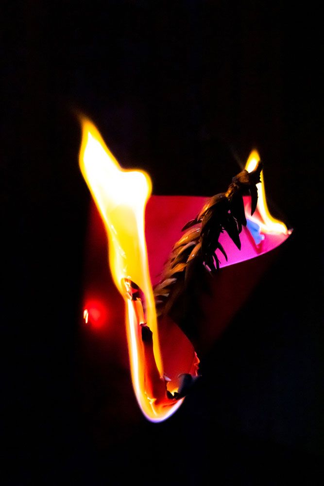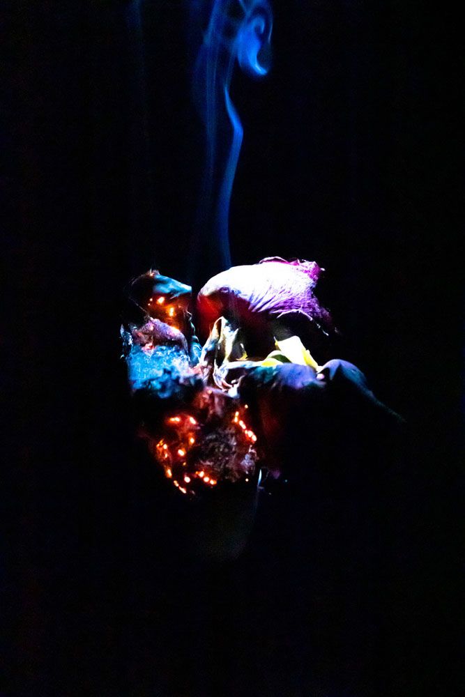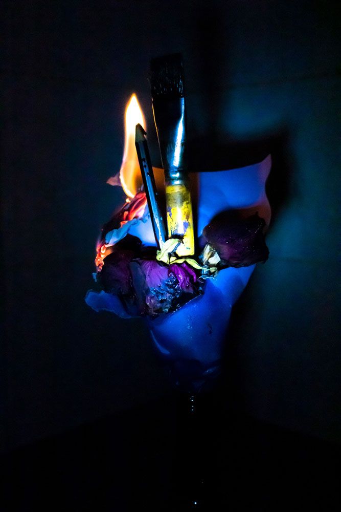Este ensaio, este fogo, estes objetos a queimar e que, a princípio podem até retratar o fim, na realidade, representam o que em mim habita, é o meu combustível, é de onde origina o meu trabalho, desta ardência que alimenta o meu trabalho como designer, a minha fotografia/arte. Estes incendiados elementos - pincel, fotos, lápis, rosas - estão diretamente
