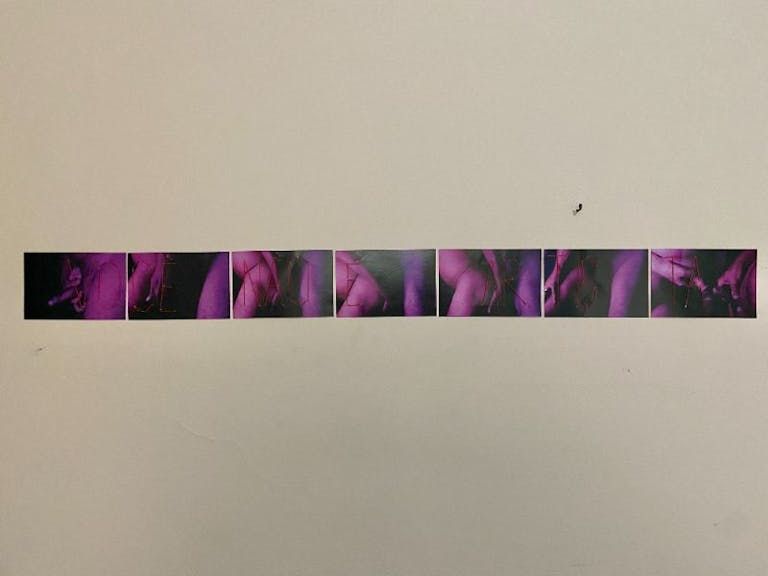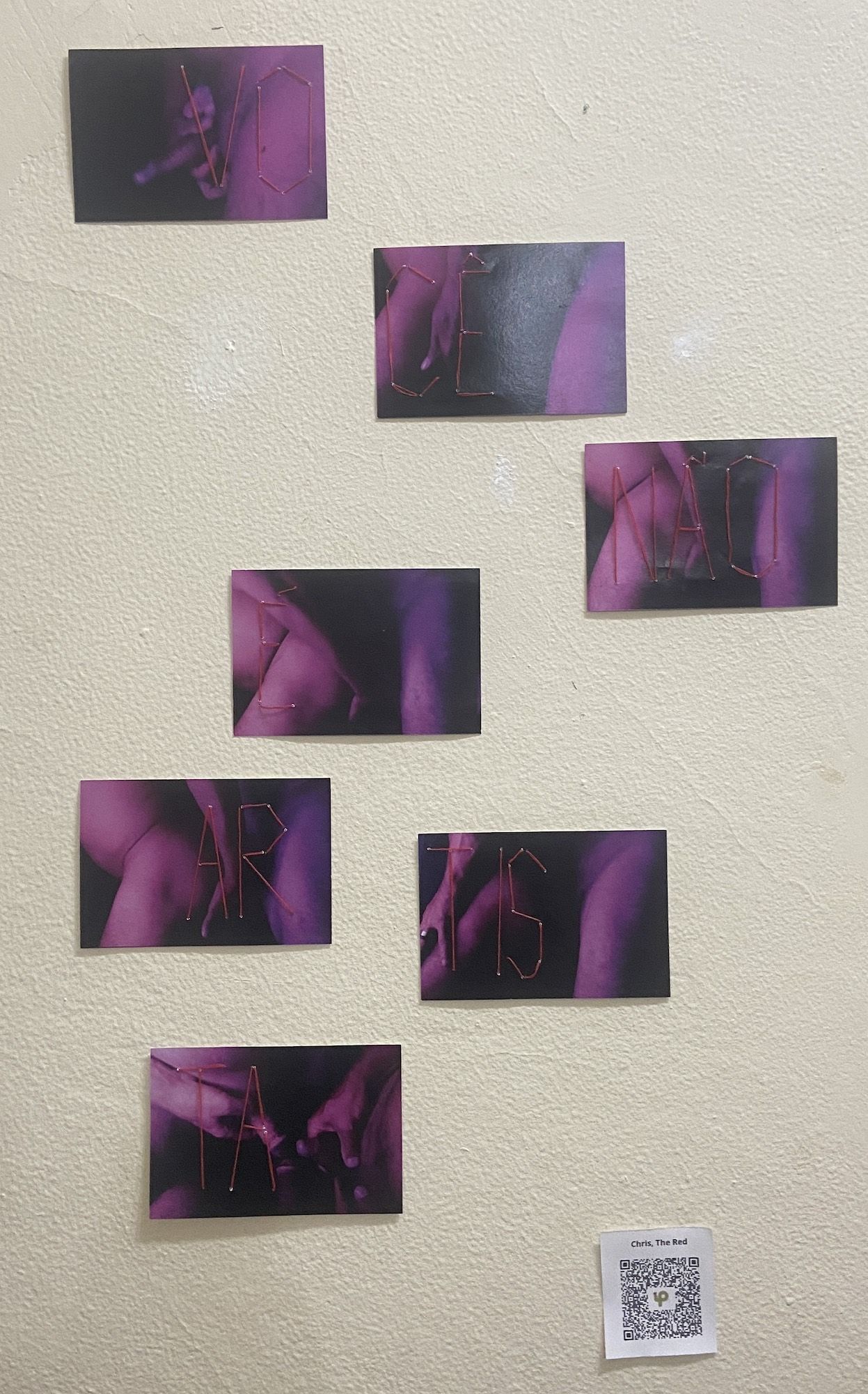 Ano: 2023Técnica utilizada: Fotografia + costura com linha vermelha. 7 fotografias impressas em offset tamanho 10 x 15 cm e em cada uma delas, costurada com linha vermelha, partes da frase-título.Dimensão (única linha): 105 x 10 cm